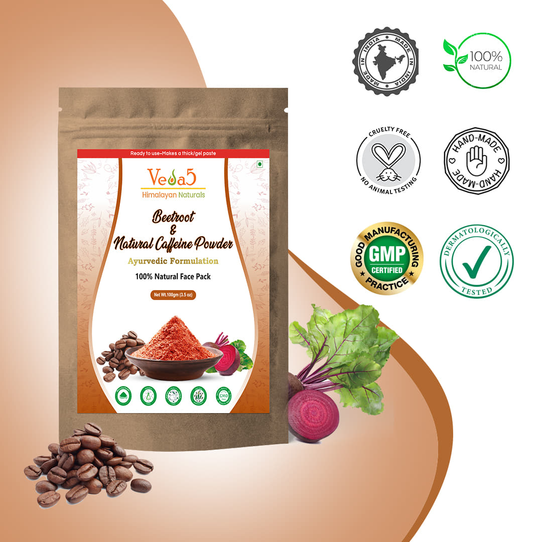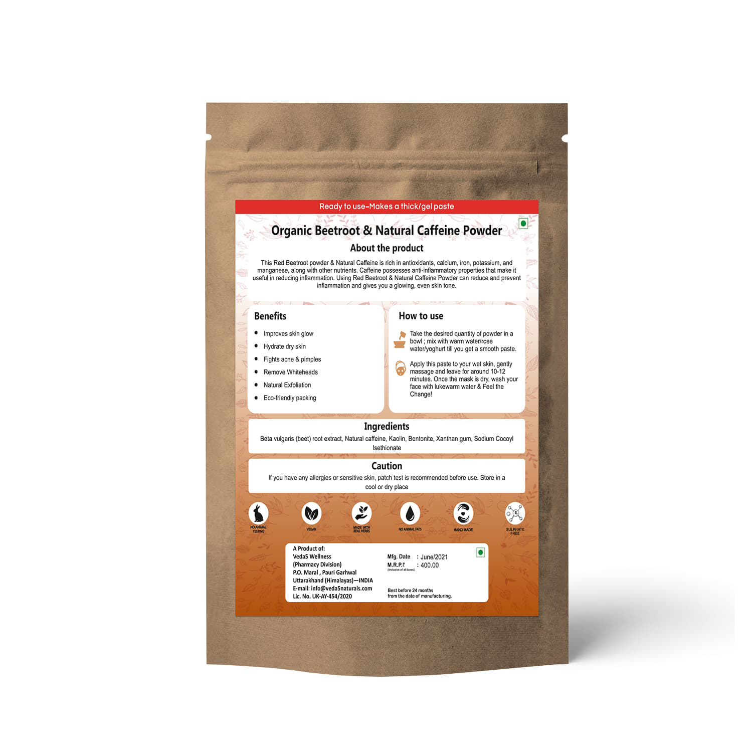 This Red Beetroot powder & Natural Caffeine is rich in antioxidants, calcium, iron, potassium, and manganese, along with other nutrients. Caffeine possesses anti-inflammatory properties that make it useful in reducing inflammation. Using Red Beetroot & Natural Caffeine Powder can reduce and prevent inflammation and gives you glowing, even skin tone.